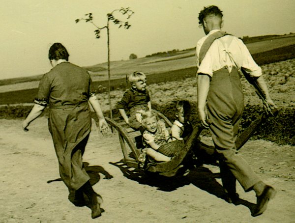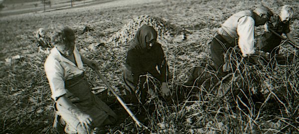 Bei den Großbauern waren auch viele fremde Helfer beim Kartoffelracken zugange. Zehn bis zwanzig Männer und Frauen schoben sich kniend mit einem Korb rechts und links vorwärts und arbeiteten sich so langsam über das Feld mit seinen Kartoffelreihen. Die Kinder halfen selbstverständlich mit, denn nach dem Krieg gab es noch keine Kindergärten. Die Versorgung der vielen Menschen mit Lebensmitteln stand nach dem Krieg an erster Stelle und so unterstützten alle Regierungen die Bauern. Aber schon 1952, nachdem die größte Not überwunden war, beschlossen die Kommunisten diese Bauern durch die Hintertür wieder zu enteignen und ihre kleinen Bauernwirtschaften in Landwirtschaftliche Produktionsgenossenschaften (LPG) zu überführen.