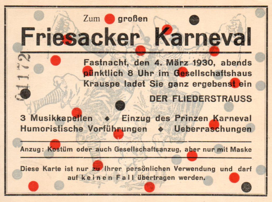 Ein vorfristiges Geschenk von Tante Carmen aus Friesack hatte es ihr besonders angetan. Tante Carmen war immer für eine Überraschung gut. Sie schenkte ihr schon vor dem Termin der eigentlichen Konfirmation eine Karte für den großen Friesacker Karneval im Gesellschaftshaus Krauspe, worüber sich die Konfirmandin am meisten gefreut hatte und bei der Konfirmationsfeier viel davon erzählte. Für Helga Schultze war es ein schöner Tag und sie erinnert sich gern daran. Oft sang sie später ihren Kindern das Faschingslied vom Friesacker Karneval vor: “Schon knospet der Flieder - froh klingen die Lieder. In Krauspes Haus ladet wieder der Fliederstrauß“.