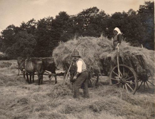 Hedwig war noch jung und hatte sich behände auf den Ast geschwungen und war in den Baumstamm geklettert, wo sie nach ängstlichen Versuchen auch glücklich wieder auf dem Erdboden ankam. Sie kam mit 20 Minuten Verspätung zu Hause an und es gab keinen glücklicheren Mann als Max, der seine Frau sofort in die Arme nahm und sich die ganze Geschichte erzählen ließ. Dann halfen alle mit, das Heu vom Wagen in die Scheune zu bringen und dort erneut kunstvoll zu stapeln. Es duftete der ganze Heuboden nach Sommer, Sonne und dem frischen Heu. Die Kühe und Pferde konnten so gut im Winter versorgt werden. Es gab ja noch andere Futtermittel im Winter, aber Heu war doch das Beste und dann noch von den eignen Wiesen. Es hingen ja auch so viele Handgriffe an dem wunderbaren Heu, was eine enge Bindung an die Dorfwiesen bedeutete.