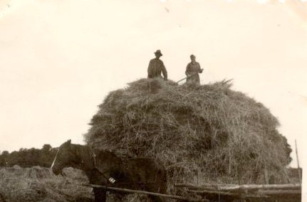 Wenn das Heu dann wirklich fertig war, mussten alle Mitglieder der Familie mithelfen, es in die Scheunen zu bringen. Es war ein trockener schöner Tag, da fuhr Max Muchow mit seiner Frau Hedwig mit dem Leiterwagen vom Hof. Auf der Wiese gab er seiner Frau auf dem Wagen große Forken voll Heu, die sie kunstvoll auf dem Wagen packte. Es durfte ja unterwegs nichts verloren gehen.