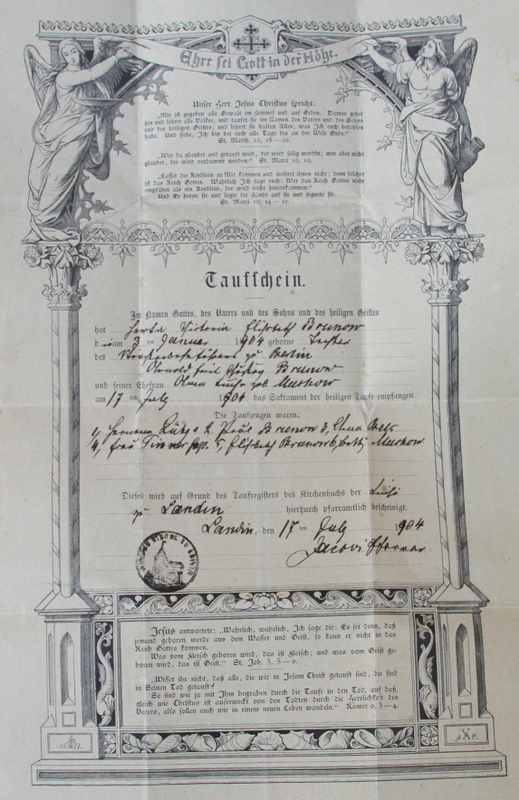 Die Tochter des Straßenbahnführers Arnold Emil Gustav Brunow und seiner Frau Anna Pauline Luise Brunow, geborene Muchow, Hertha Victoria Elisabeth Brunow wurde am 03.01.1904 in Berlin geboren. Der Großvater Ferdinand Muchow aus Landin war sehr erfreut über seine erste Enkeltochter und vereinbarte mit den Eltern, dass das Kind in Landin getauft werden sollte. So kam es, dass der Pfarrer Jacobi am 17.07.1904 das Sakrament der heiligen Taufe in der Landiner Dorfkirche dem kleinen Mädchen spendete. Als Paten oder Taufzeugen waren Hermann Lübge, Paul Brunow, Elisabeth Brunow und Betty Muchow dabei. Die kleine Hertha ließ die Wassertaufe ohne erkennbare Zeichen der Anteilnahme über sich ergehen. Sie schlief die ganze Zeit auf dem Arm ihrer Mutter. Es war ein herrlicher Sommertag an diesem Sonntag und der Sommerwind wehte dazu kräftig, sodass alle Damen ihre Hüte festhalten mussten, als es von der Kirche in die Gaststätte Ferdinand Muchow zum Feiern ging. Betty Muchow war schon vorgelaufen mit dem Kinderwagen, denn es hieß, je schneller der Täufling zu Haus ist, desto fixer würde ihm später alles von der Hand gehen. Sie hatte auch zwei Stecknadeln in den Kinderwagen gesteckt. Das sollte schützen vor bösen Blicken. Hertha ließ sich aber durch nichts aus der Ruhe bringen. Sie trank die Brüste ihrer Mutter nach der Taufe fast leer und schlief dann weiter, ohne die Taufgesellschaft im Geringsten zu beachten. Die Männer hatten sich vor der Gaststätte niedergelassen und tranken erst einmal ein Glas Bier, denn es war sehr warm an diesem Tag. In der Gaststube wurde das Mittag vorbereitet. Der stolze Vater hielt vor dem Mittagessen eine kleine Rede und bedankte sich für die vielen Geschenke. Es waren selbst gestrickte und genähte Kleider für das Baby und viele Sachen zum Anziehen und auch etwas Geld dabei. Dann sprach der Pfarrer Jacobi ein sehr langes Tischgebet, ehe er mit seiner Frau Christlinde die Suppe löffelte: