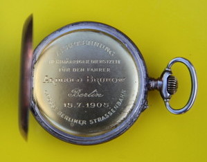 Arnold Brunow war ein sehr zuverlässiger Straßenbahnführer und am 15.7.1905 hatte ihm sein Betrieb eine vergoldete Uhr geschenkt, auf deren Rückseite folgende Worte eingraviert waren: Anerkennung mehrjähriger Dienstzeit für den Fahrer Arnold Brunow Berlin 15.7.1905 Grosse Berliner Strassenbahn. Er war natürlich stolz auf diese Auszeichnung und fuhr nun noch pünktlicher ab, denn die Uhr ging sehr genau. Er hatte sie auch immer bei sich und legte sie nur ab, wenn er in sein Nachtgewand schlüpfte.