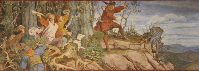 Er ließ von seinen Untertanen Körbe mit Erde von der Schauenburg auf die Wartburg bringen und dort ausschütten. Als die Frankensteiner das Land für sich reklamierte, schwor Graf Ludwig der Springer vor dem König, dass die Erde ihm gehöre, auf dem er die Wartburg errichten wollte. 12 Mitstreiter des Grafen stießen dazu ihre Schwerter in den Boden und beschworen, dass das Land dem Grafen Ludwig gehörte, was ja durch den Trick nicht ganz falsch war, aber eben doch nur eine List war. 1131 wurde der Sohn Ludwig des Springers, Ludwig I., vom Kaiser Lothar III. zum Landgrafen ernannt. Landgraf Ludwig II. (Regierung von 1140-1172) war der bedeutendste Bauherr für die Wartburg. Im Palas der Wartburg befindet sich ein großes Wandgemälde von Moritz von Schwind, das den „Sängerkrieg“ auf der Wartburg darstellt. Im Mittelpunkt stehen dabei die beiden Minneliederdichter Walther von der Vogelweide und Wolfram von Eschenbach. Wolfram von Eschenbach war 1203 am Thüringer Hof. Er ist bekannt als Dichter des „Parzival.“ Dieses mittelalterliche Epos diente Richard Wagner als Vorlage für seine Oper „Parzival.“ Auf der Wartburg wurde ein künstlerischer Wettstreit darum ausgetragen, wer in seinen Dichtungen am besten den Fürsten und die Fürstin loben könne. Walther von der Vogelweide hat dabei ein sehr berühmtes langes Gedicht (Reichsklage) geschrieben, dass so begann: