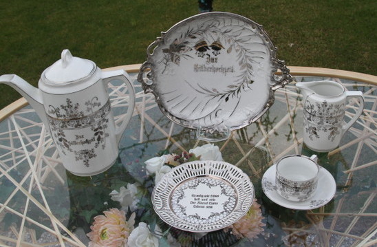 Auf der Kaffeekanne stand „Zur Silberhochzeit“ und auf der Kuchenplatte auch. Jeder Kuchenteller war mit dem gleichen Spruch verziert: