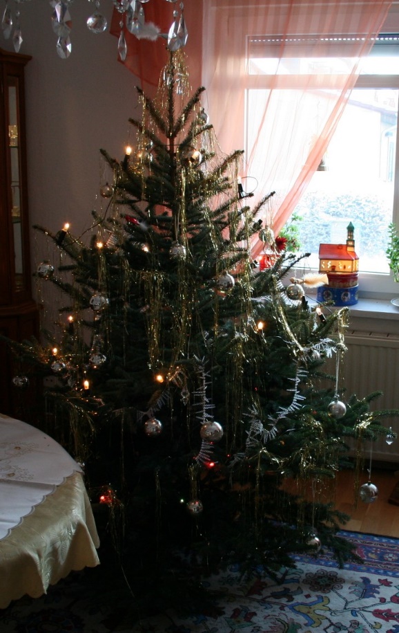 Das ganze Fest war dadurch für ihn verdorben, aber seine Frau tröstete ihn und sagte, sie finde diesen Ersatzbaum dieses Jahr besonders schön. So beruhigte er sich allmählich wieder und es wurde dann doch noch ein schönes Fest. Am Heiligabend gab es Kartoffelsalat mit Würstchen und zum Weihnachtstag eine Wildgans mit Rotkohl und Kartoffeln und als Nachtisch Birnenkompott. Seine Frau hatte auch einen Apfelkuchen gebacken und Kekse, sodass dann alles doch in weihnachtlichem Frieden harmonisch endete.