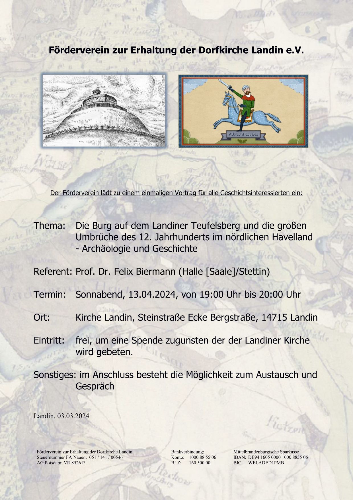 Dem Landiner Förderverein ist es gelungen, Prof. Dr. Felix Biermann für einen einmaligen Vortrag in der Landiner Kirche am 13.04.2024 um 19:00 Uhr mit dem Titel "Die Burg auf dem Landiner Teufelsberg und die großen Umbrüche des 12. Jahrhunderts im nördlichen Havelland - Archäologie und Geschichte" zu gewinnen.