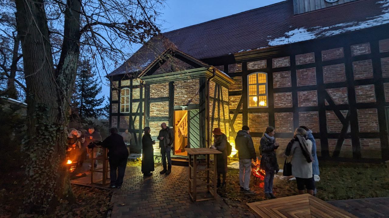 So weihnachtlich gestimmt, verweilten nach dem Konzert noch viele Besucher bei Kaffee und Kuchen bzw. Bratwurst und Brötchen in der Kirche und draußen an den Feuerkörben vor der effektvoll beleuchteten Fachwerkkulisse der Kirche.