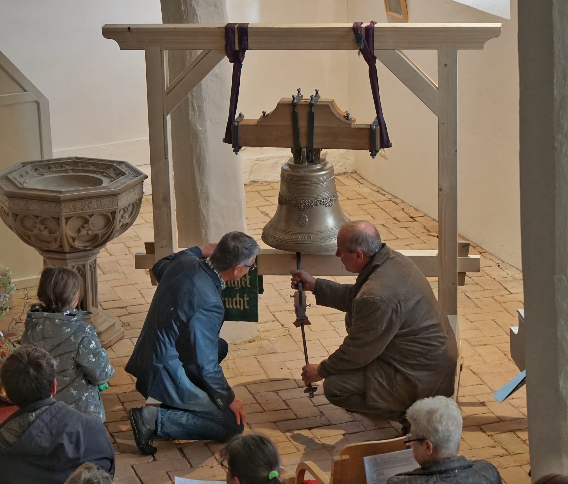 Die Glockenweihe wurde sehr feierlich vom Superintendenten Thomas Tutzschke und vom Pfarrer Gerd Zelmer zelebriert. Der Superintendent berichtete von den Glocken in Köln, Niederrursel, Bad Salzuflen und Landin, denn all diese Orte sind durch den selben Glockengußtermin verbunden, sie sind im wahrsten Sinne des Wortes aus einem Guß. Er verband die In-Dienst-Stellung der Glocke mit dem Wunsch, dass gerade aufgrund des Schicksals der Vorgängerglocke die neue Glocke stets zu friedvollen Zwecken dienen und läuten solle. Und so lautet der Name der Glocke auch „Landiner Friedensglocke“ mit der Inschrift „Dona Nobis Pacem“. Für diesen Namen hatte sich die Gemeinde und der Verein bereits vor Beginn der schrecklichen Kriege in der Ukraine und in Nah Ost entschieden – möge der Zweiklang der Glocken die Menschen daran erinnern, wie wichtig der Frieden auf Erden ist.