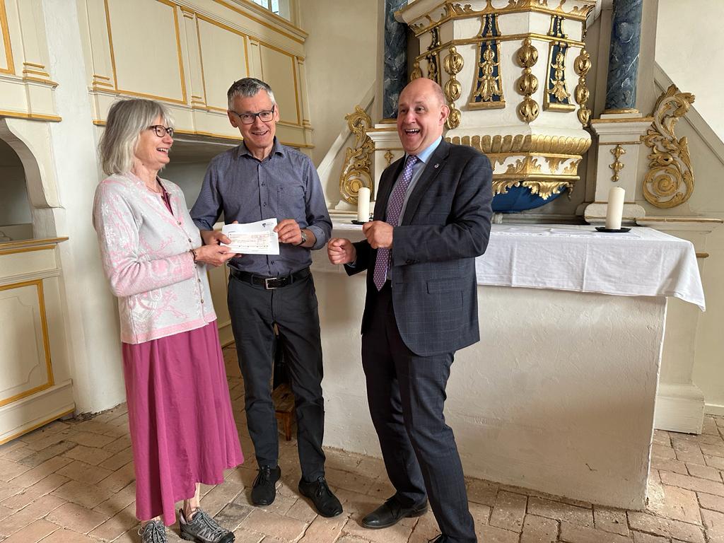 Der Landrat interessierte sich sehr für die Geschichte des Gebäudes und die Arbeit des Vereins. Er begutachtete fachmännisch den frisch restaurierten Kanzelaltar und scheute sich nicht, bis auf den Kirchboden zu steigen und die Turmkonstruktion sowie den Glockenstuhl zu besichtigen.