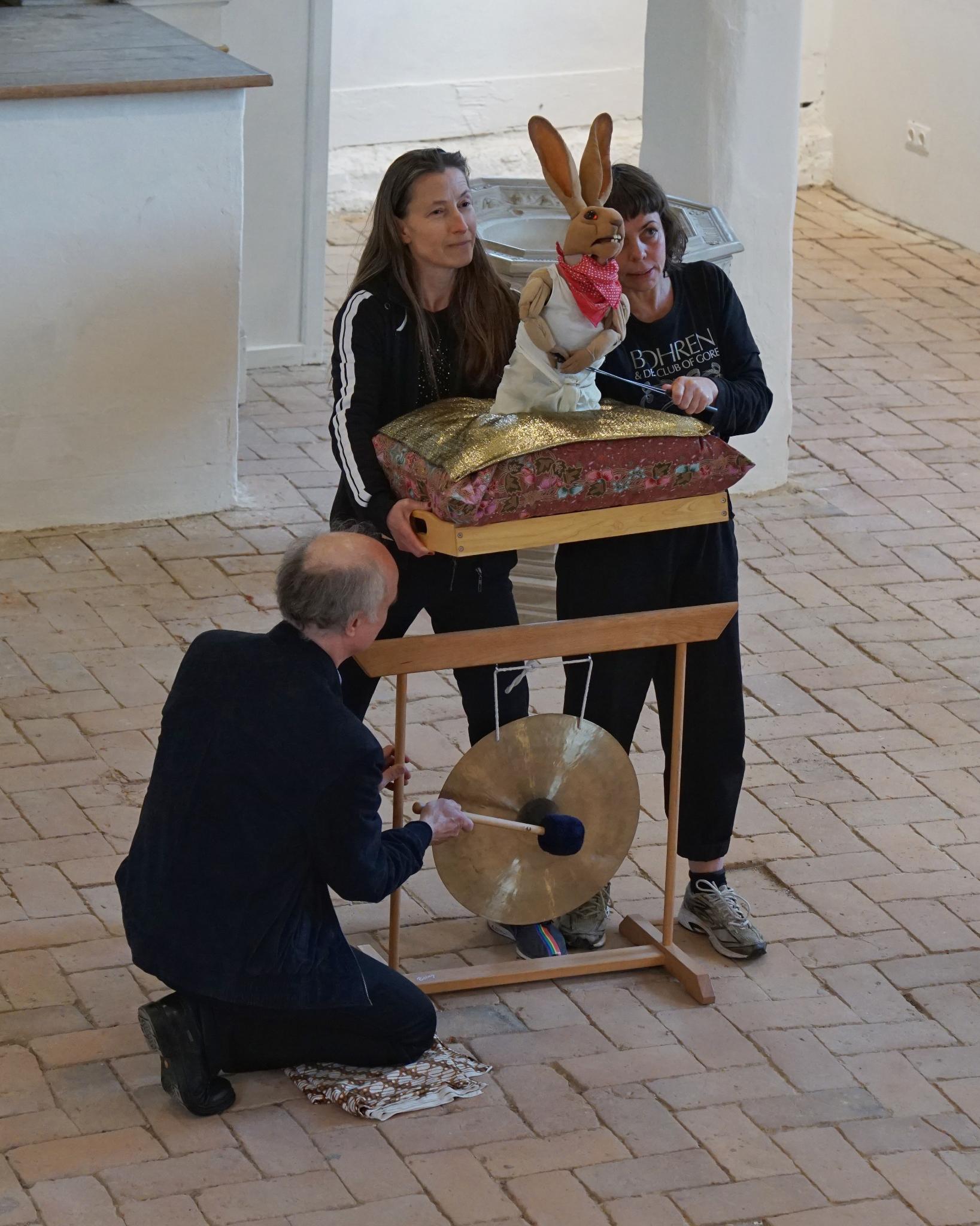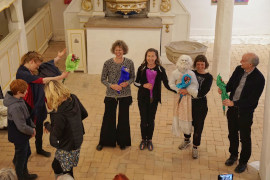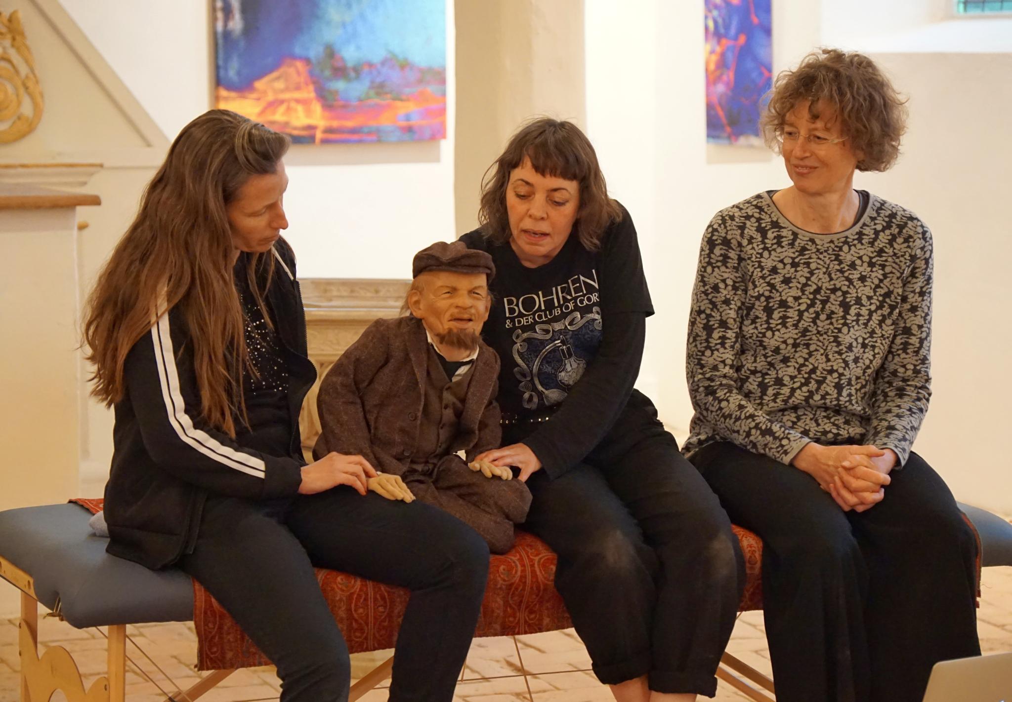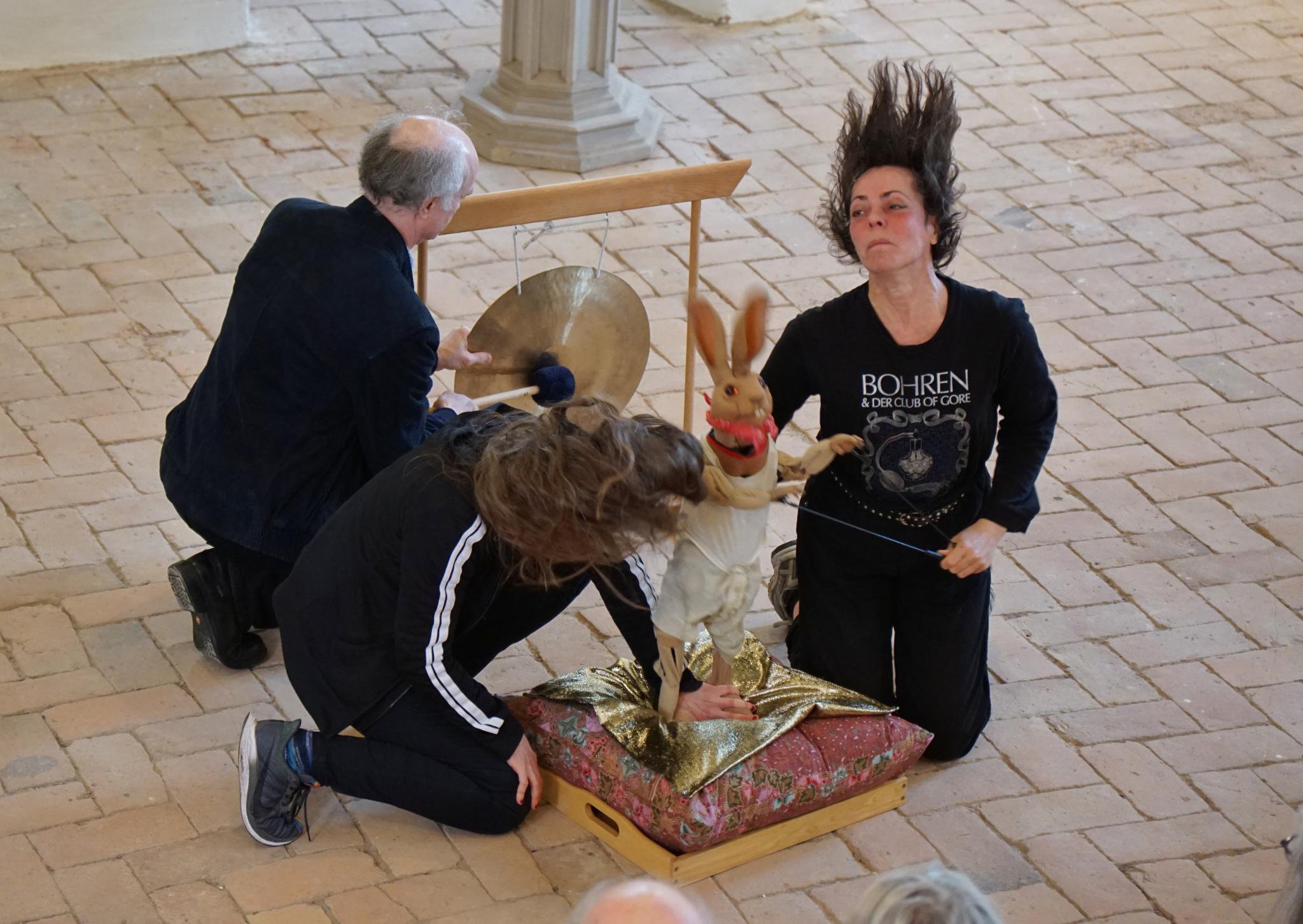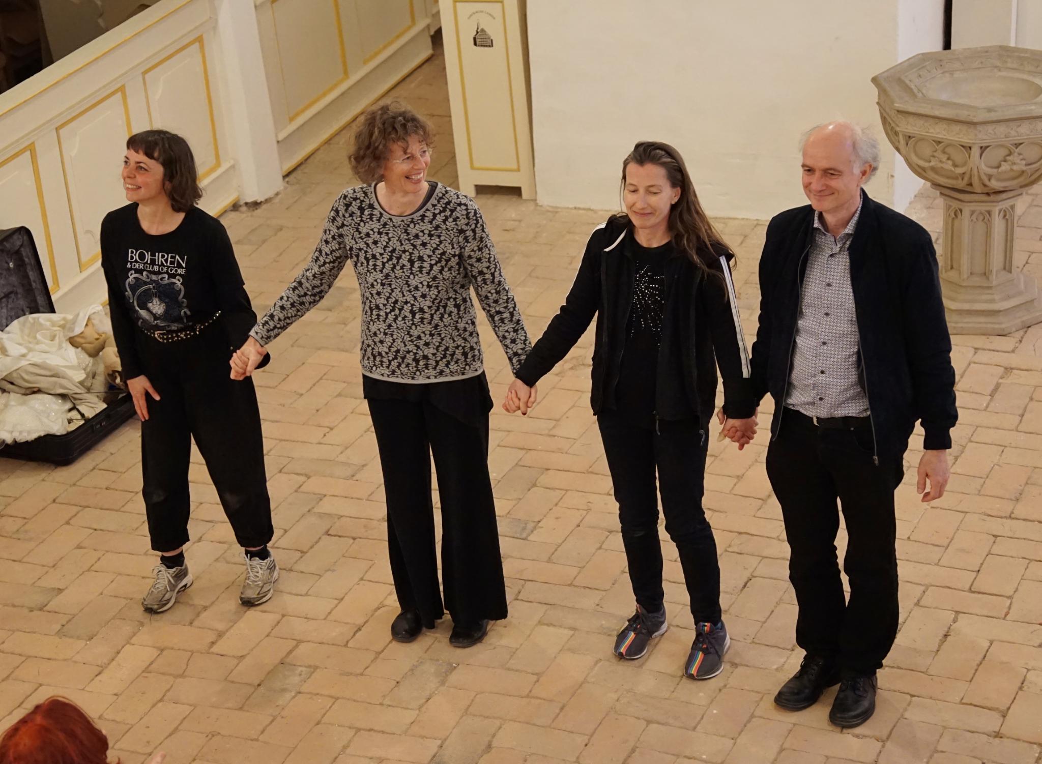 Suse Wächter (Puppenspiel), Ulrike Krause (Tanz, Klavier und Gesang), Sonja M. Schultz (Autorin) und Jörg Schmid (Pfarrer, Flötist und Märchenerzähler) hatten spontan und improvisiert ein anspruchsvolles Programm zusammengestellt, welches dem Publikum einiges an Aktivität abverlangte und von Anfang an fesselte.