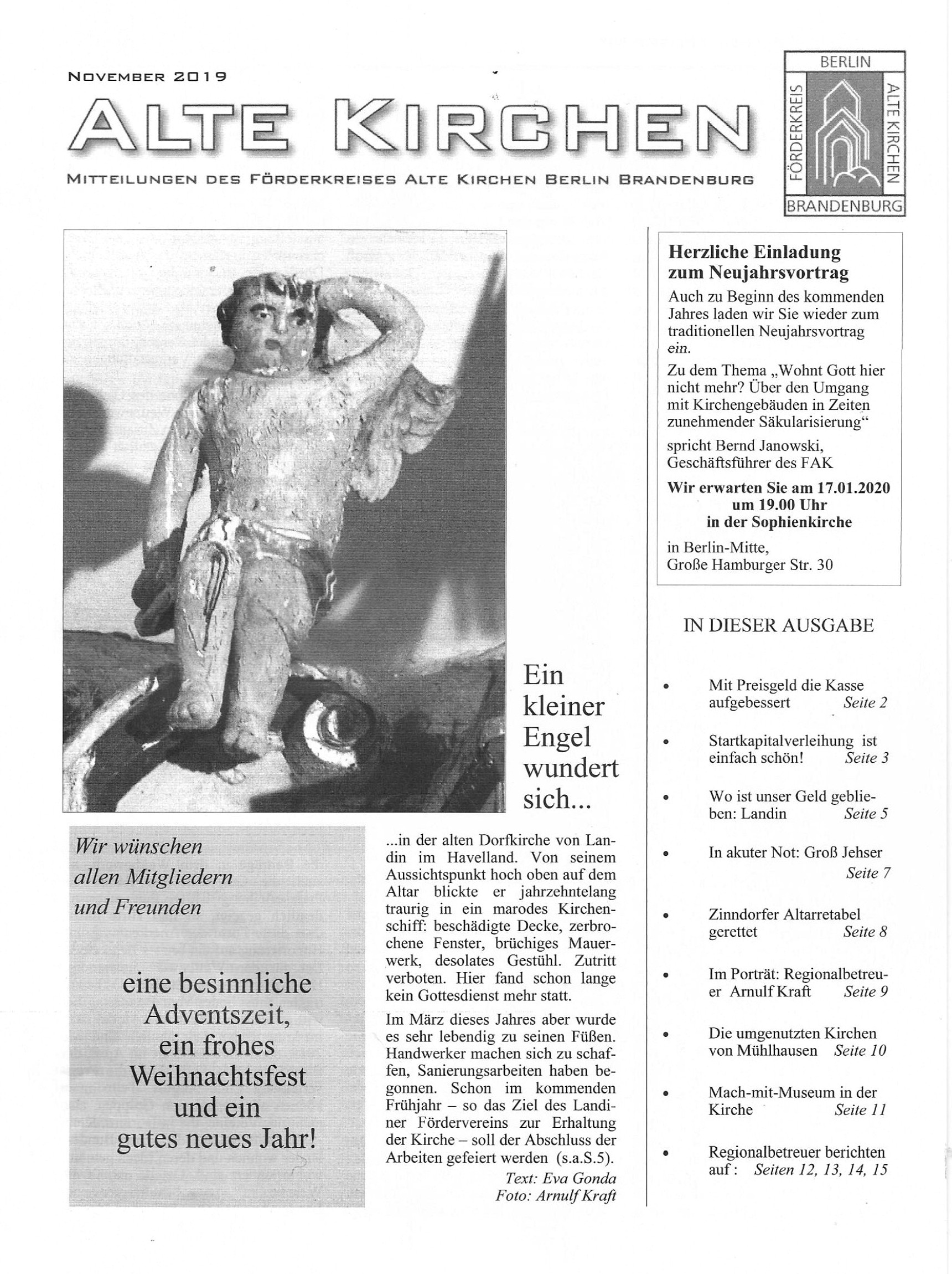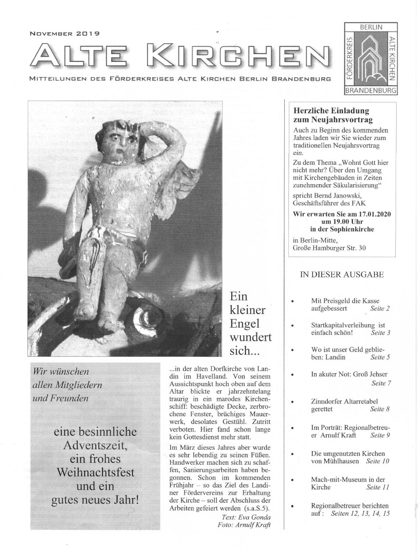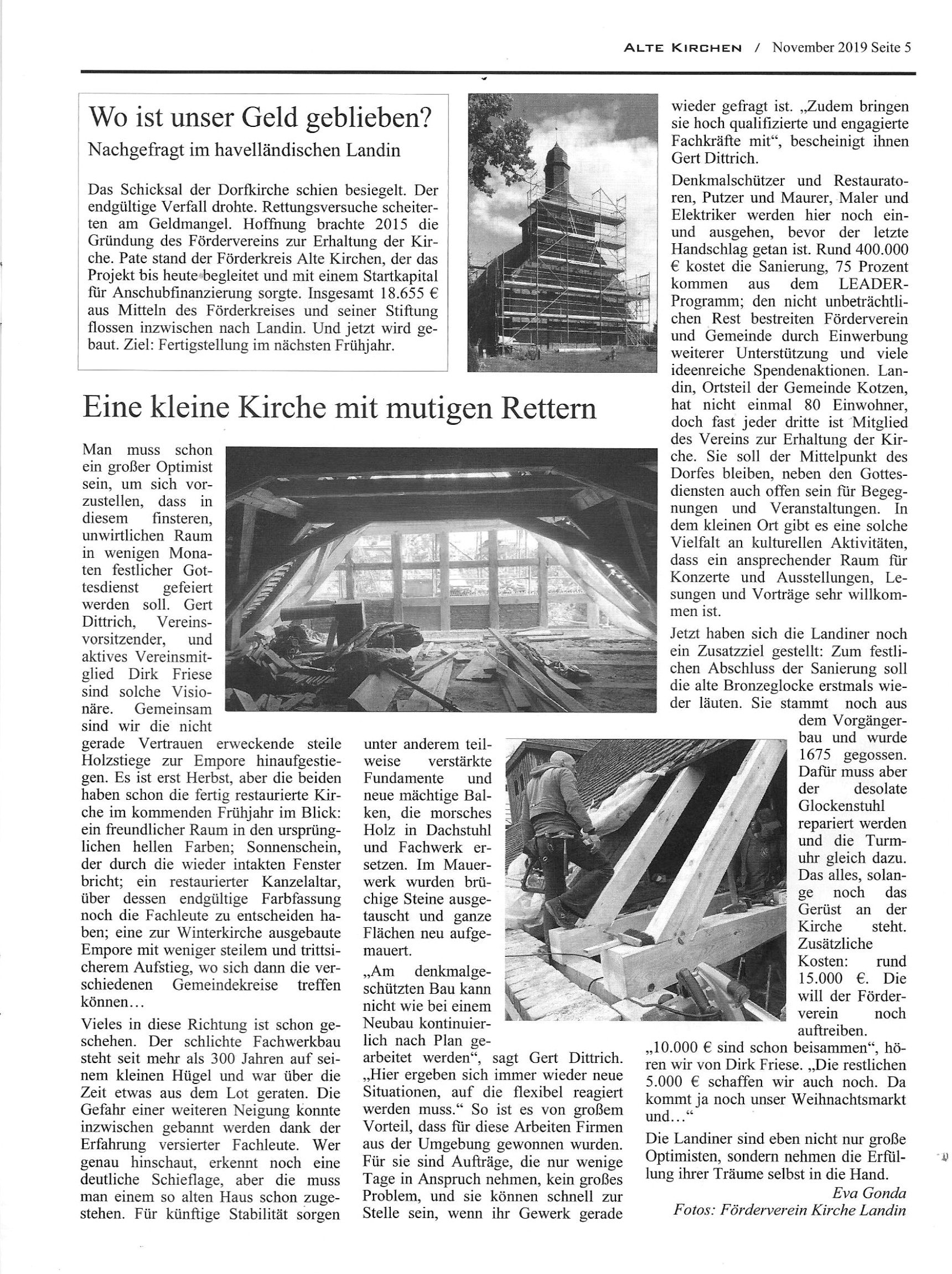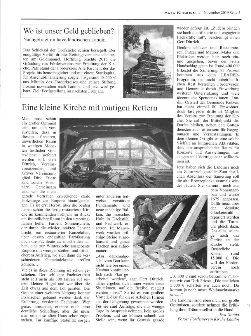 Am Freitag, 27.09.2019, berichtete die Märkische Allgemeine Zeitung über den Stand der Sanierungsarbeiten der Landiner Kirche und unterstützte unseren Spendenaufruf für die Installation der Glocke und der Turmuhren.