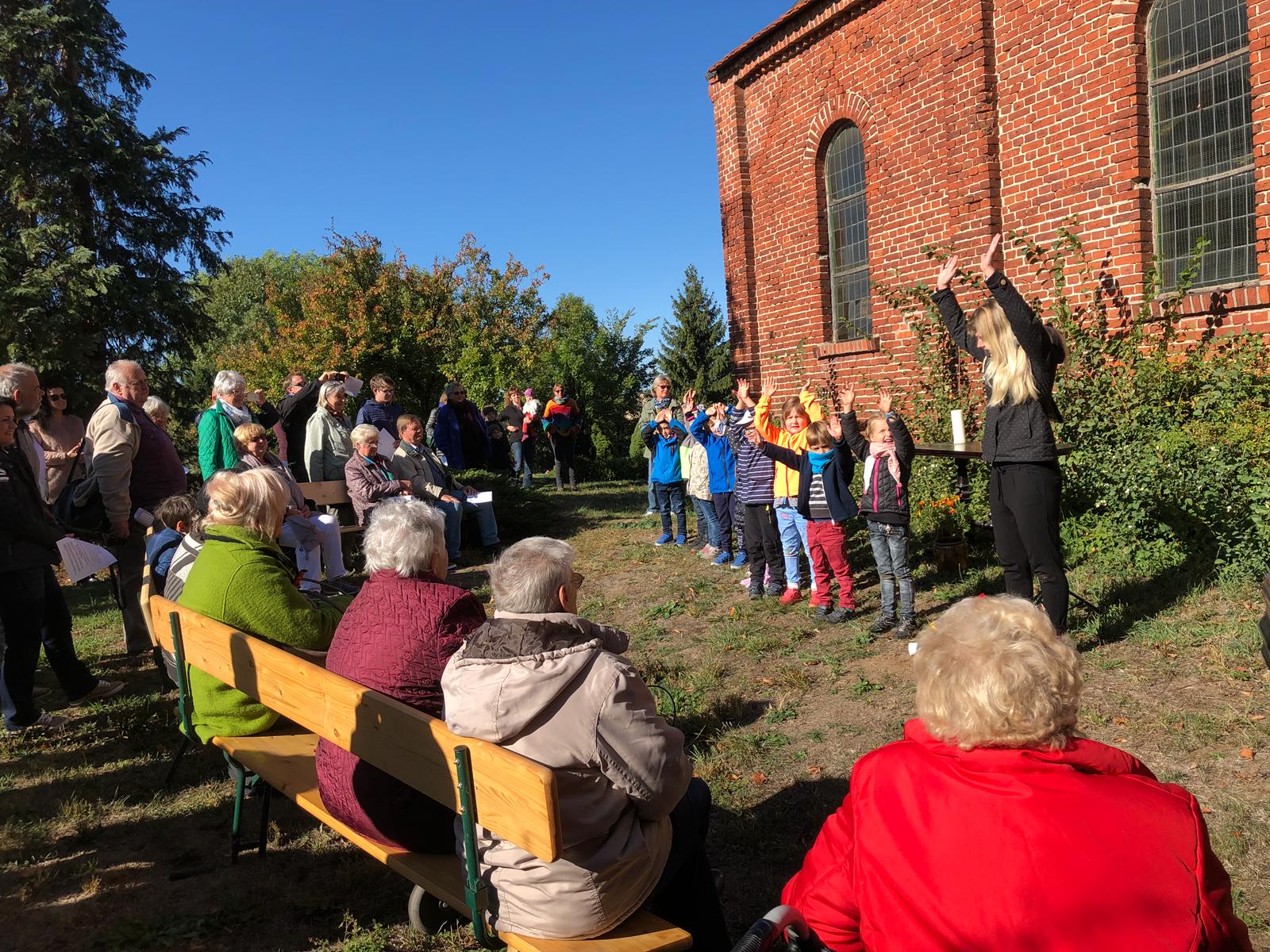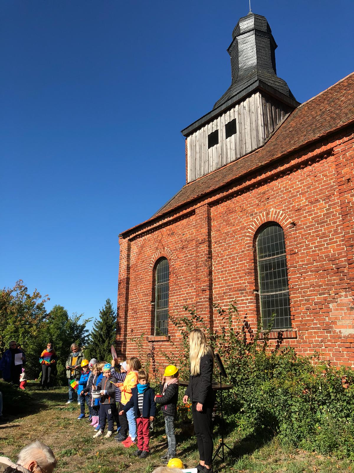Viele Landiner und Freunde der Landiner Kirche sind aus diesem Anlass und bei herrlichsten Sonnenschein auf den Landiner Kirchberg gekommen. Der Festakt begann mit einer Gesangsdarbietung des Stechower Kindergartens, die für viel Freude und Unterhaltung sorgte. Die Gruppenleiterin der Kita, Raika Koch, erklärte vor dem Auftritt ihrer Kinder, wieviel die Sanierung und Wiederinbetriebnahme der Landiner Kirche ihr persönlich bedeutet: hier wurde sie getauft, hier heirateten ihre Eltern, ihr Bruder erhielt hier seine Konfirmation. Die Kinder sangen unter anderem „Wer will fleißige Handwerker sehen, der muß nach Landin hingehen...“ das war zweifellos der künstlerische Höhepunkt des Vormittages und erfreute alle Zuschauer.