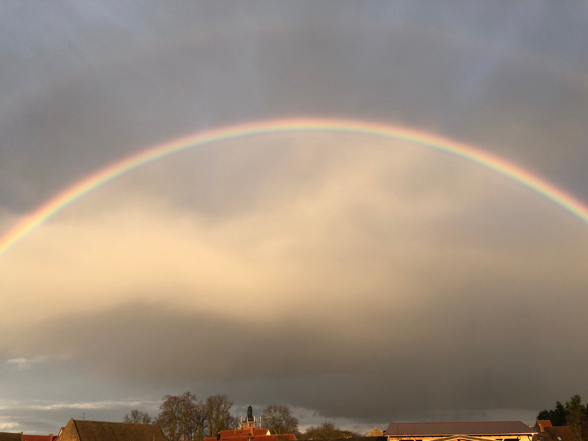 Am 17.03.2019 entstand dieser Schnappschuss von der für die Baumaßnahmen eingerüsteten Kirche unter einem Regenbogen.