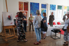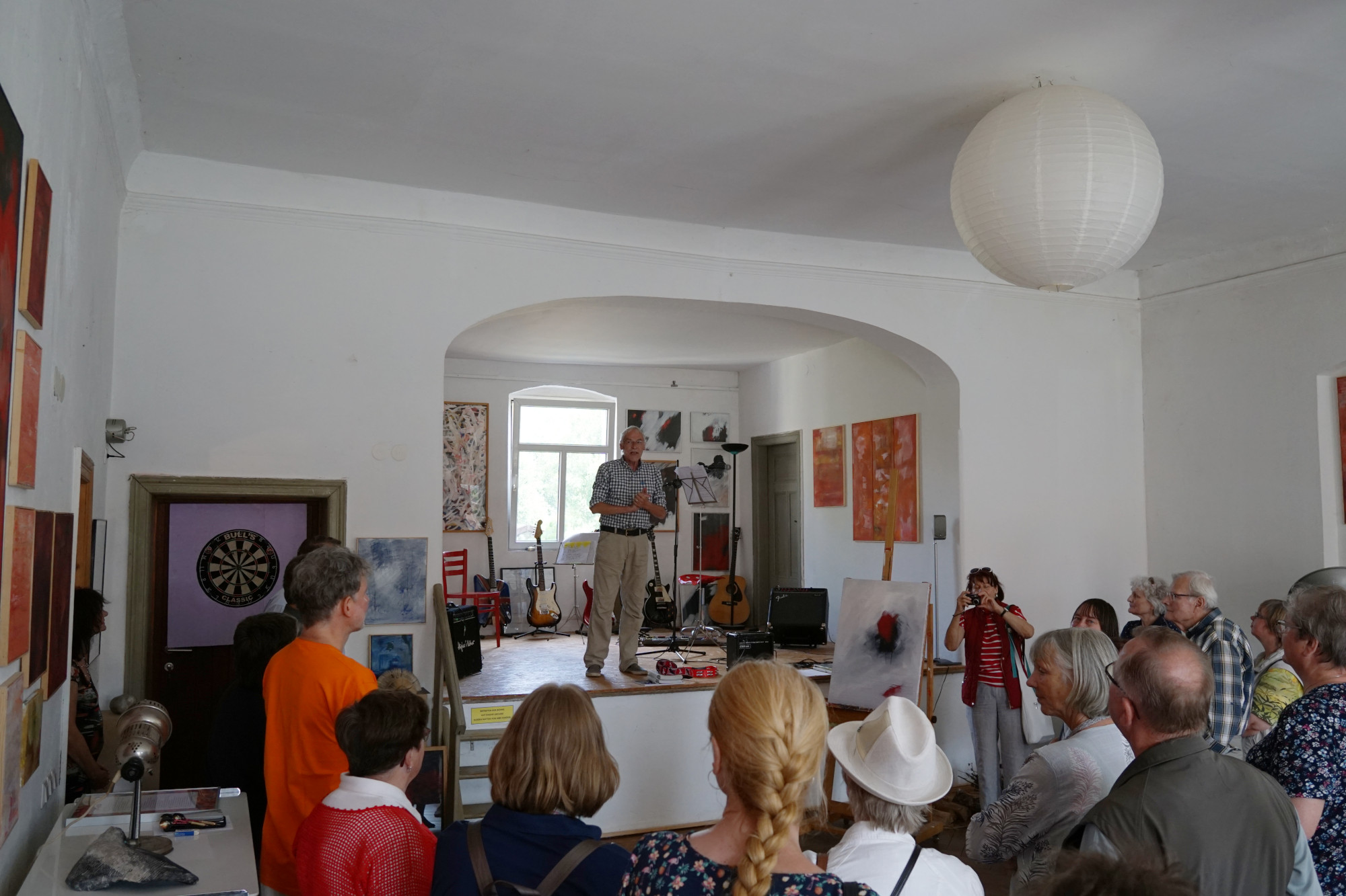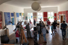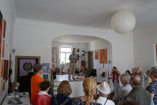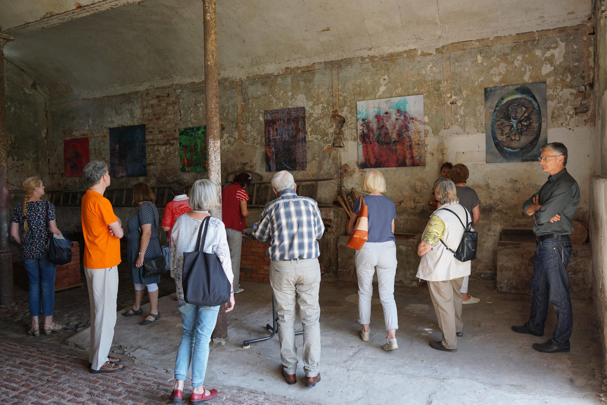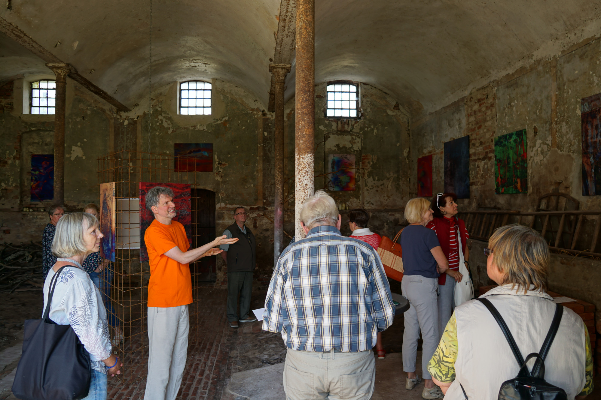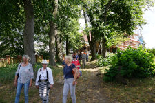 Am 13.07. besuchte uns der Memento e.V. aus Rathenow mit 17 Teilnehmern in Landin. Der Verein kümmert sich um den Erhalt des Rathenower Friedhofs und des historischen Torhauses, worin wechselnde Ausstellungen präsentiert werden. Daher waren die Teilnehmer auch kundiges Publikum beim Besuch der Landiner Künstler Uthea und Chris Dormer (Malerei, Grafik und Design) im alten Landiner Gasthaus und des Keramikers und Digitalfotokünstlers Dirk Friese im ehemaligen Landiner Grafenstall. Auch bei der anschließenden Führung über die Baustelle der Landiner Kirche war viel Sachkenntnis zu spüren.