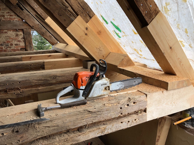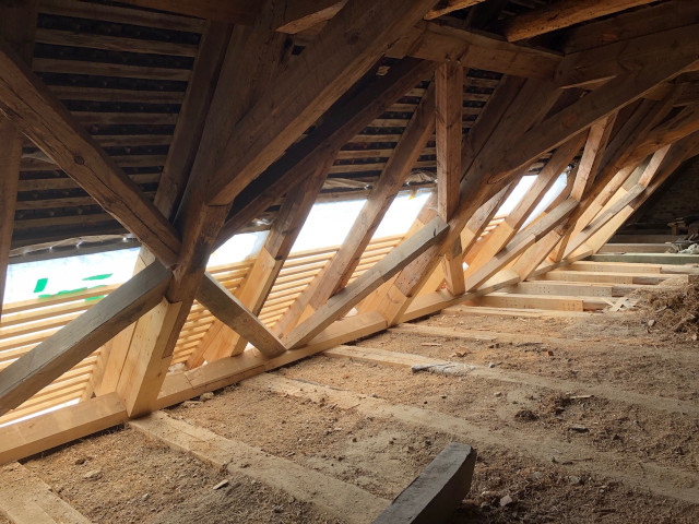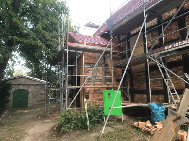 So können wir jetzt schon voller Zufriedenheit auf folgende fertig gestellten Arbeiten schauen: Abbau des gesamten nördlichen Vorbaus, Verstärkung des Fundaments, Ergänzung des Fachwerks, neues Dach des Vorbaus nach historischem Vorbild, die Gefache sind bereits wieder sauber ausgemauert und die Deckenbalken und Sparrenköpfe der Südseite wurden fachgerecht saniert; im Innenbereich ist bereits die Unterschalung an den Deckenbalken und der Putzträger aus Schilfrohr für den Lehmputz befestigt.