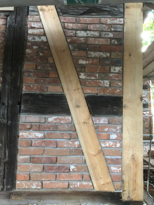 Auch der Ostgiebel wurde komplett von seinen Gefacheausmauerungen befreit. Das Fachwerk wurde umfangreich saniert und die Gefache anschließend mit Altziegeln und neuen Ziegeln wieder geschlossen.